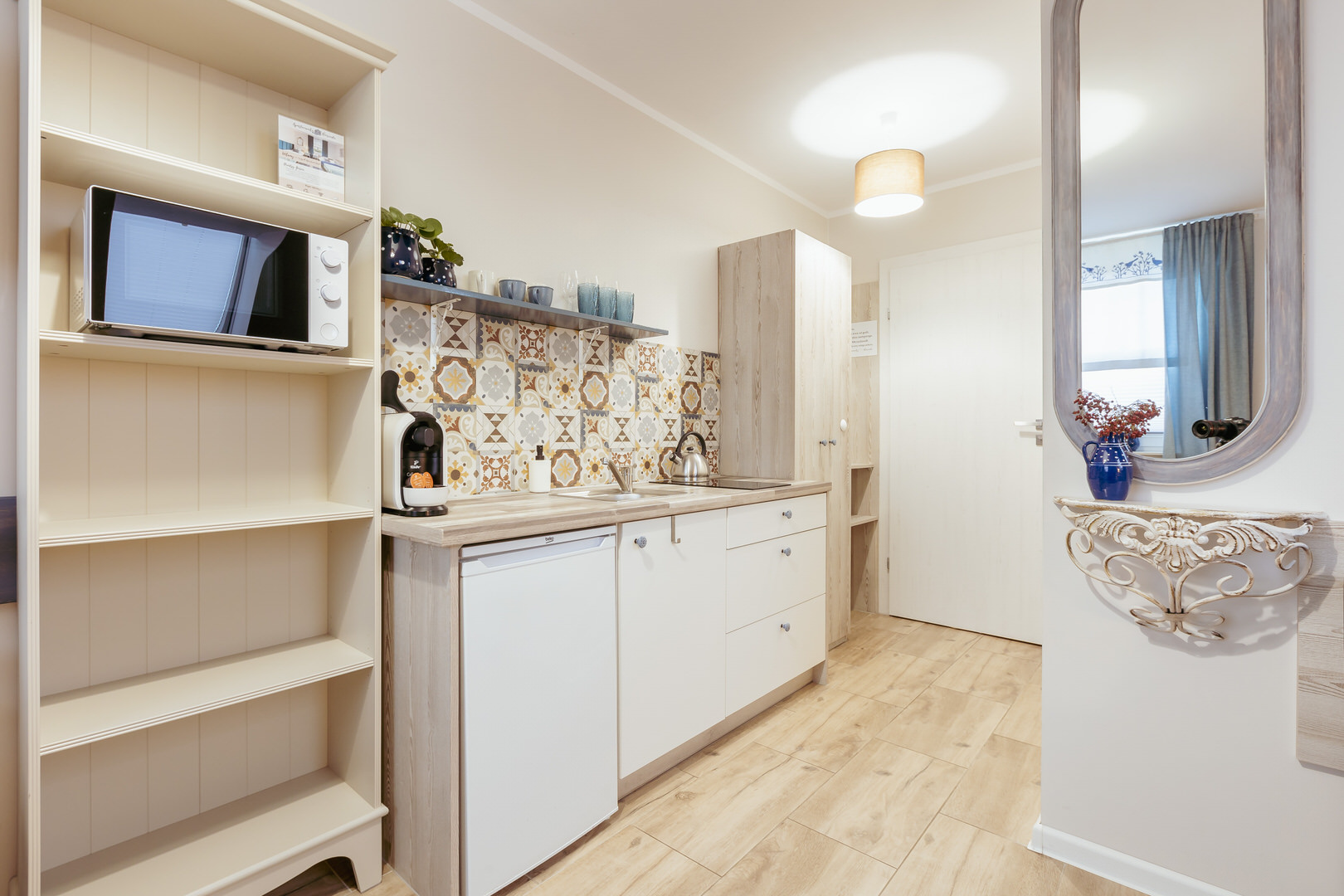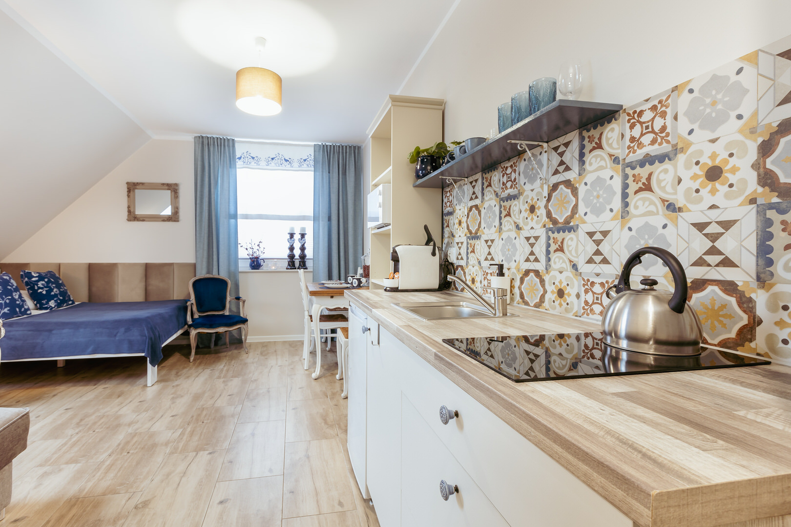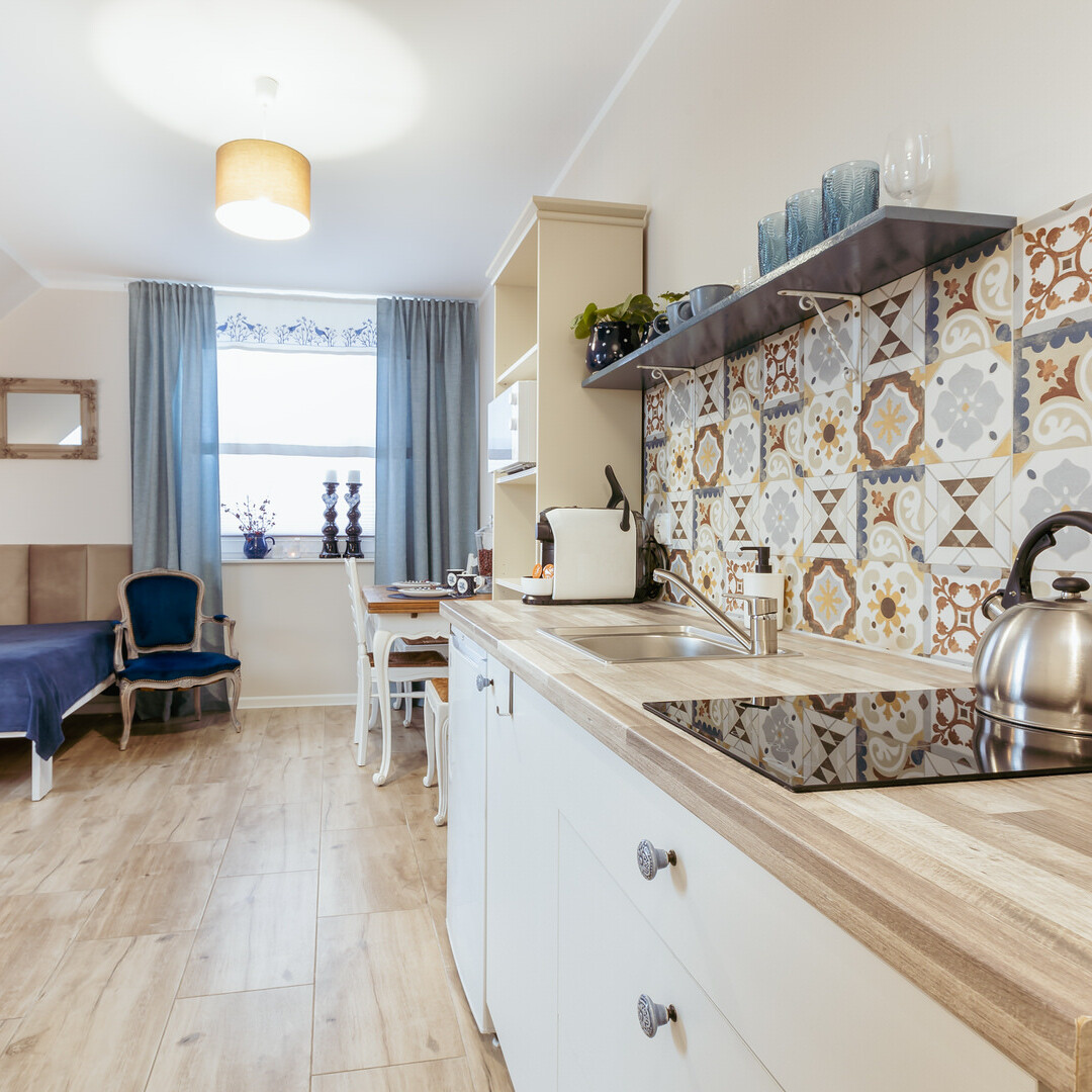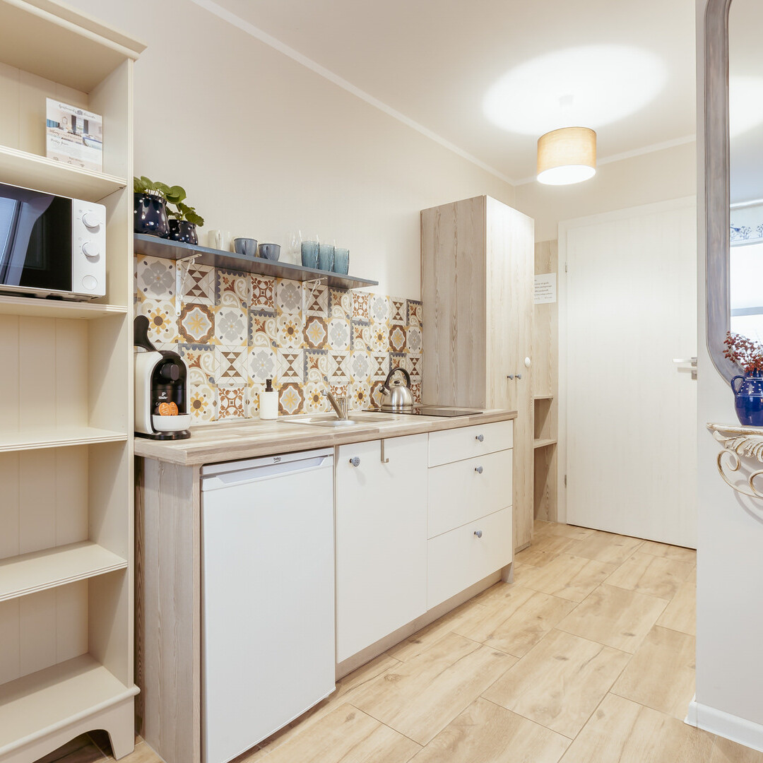 - aneks kuchenny z wyposażeniem (talerze, szklanki, sztućce)